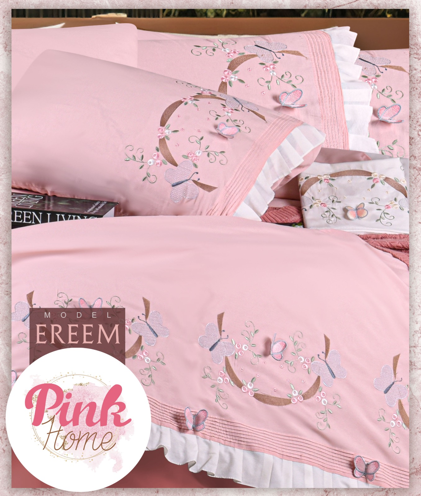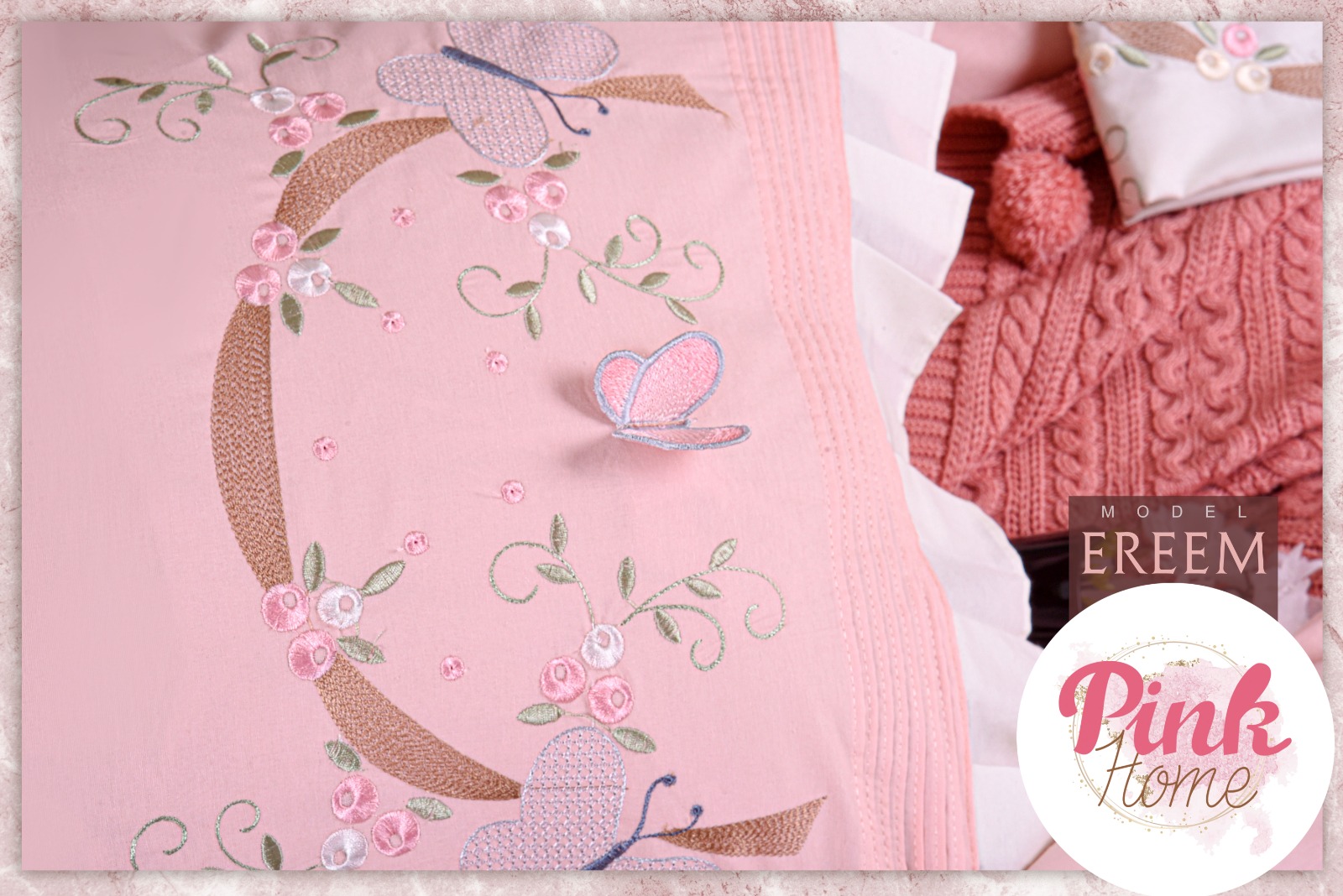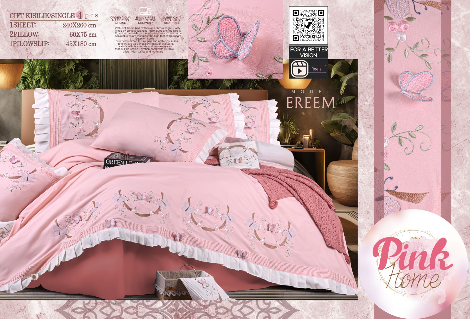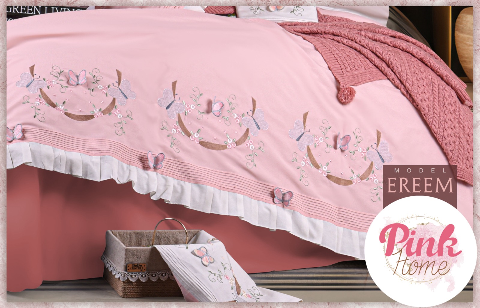 طقم سرير كبير مطرز بالورد و الفراشات المبهجة الطايرة على الطقم لتضيف لمسة أناقة لغرفة نومك